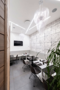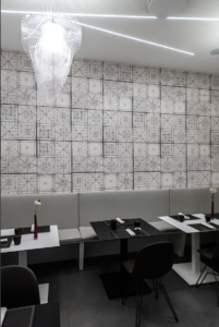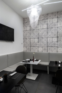 Descrizione: Nelle periferia della città di Foggia nasce il Ristorante LA KUCINA. Il progetto architettonico della sala, che ospita in totale 60 coperti, prevede diversi allestimenti di interior design che coesistono armonicamente nel medesimo ambiente. In posizione appartata rispetto alla sala principale, prossima all’ingresso del ristorante, si struttura la stanza privè. In quest’ambiente, autonomo e versatile, idoneo per le feste private come per gli incontri più formali, s’inserisce alla perfezione la scultura luminosa Aria, design di Zaha Hadid, che firma con la sua visionaria e dinamica semantica lo stile versatile e moderno della sala.